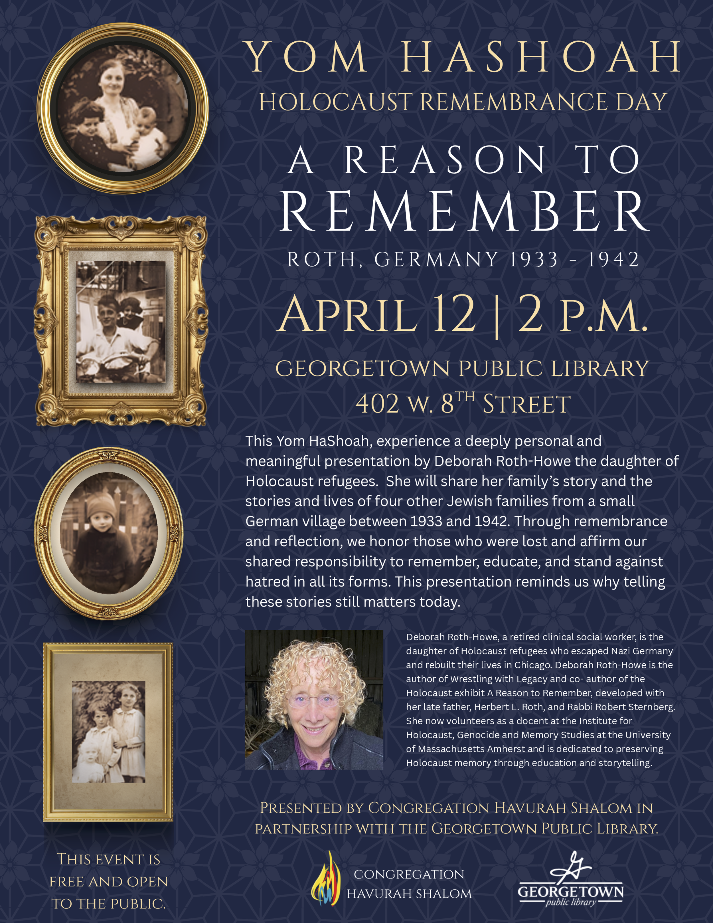 In recognition of Yom Hashoah (Holocaust Remembrance Day), Deborah Roth-Howe along with Congregation Havurah Shalom of Sun City, Texas and in partnership with the Georgetown Public Library, have created a thought-provoking and inspiring program titled “A Reason to Remember: Roth, Germany 1933-1942".