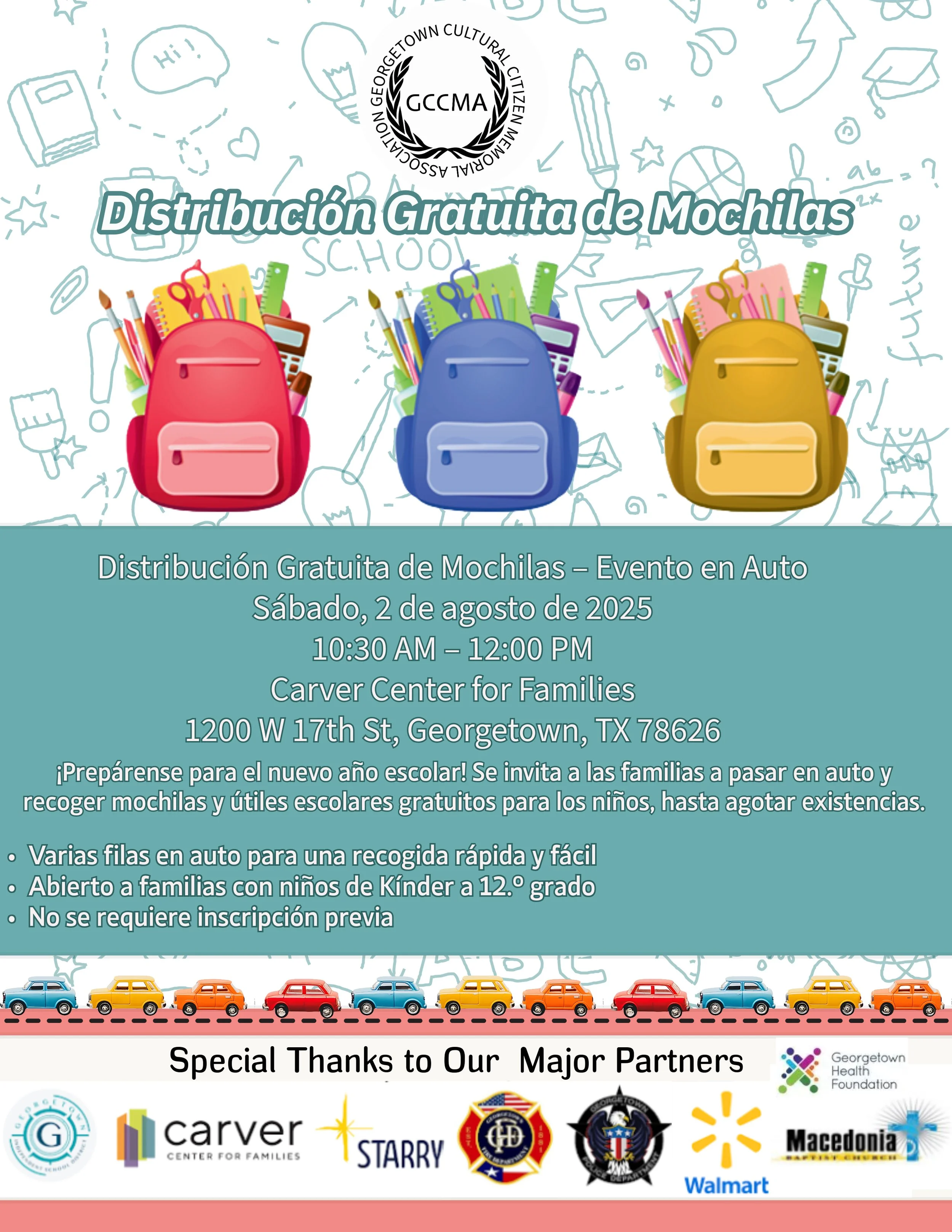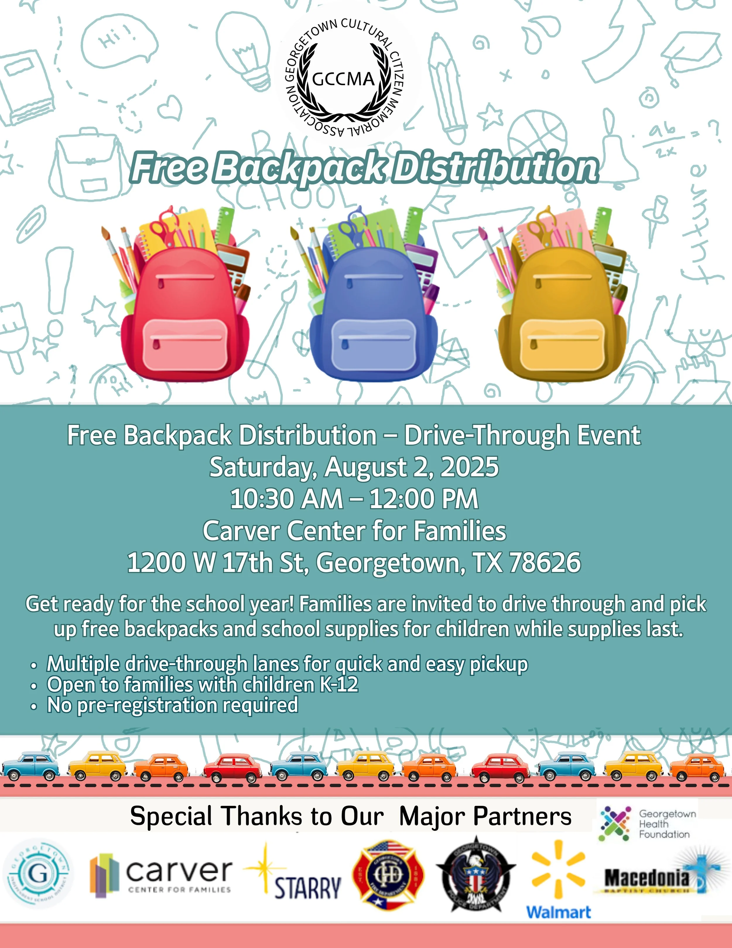 Community partners join forces each year to provide free backpacks and supplies to families in Georgetown ISD. Save the date and plan to join us on Saturday, August 2 from 10:30 am - 12:30 pm at the Carver Center for Families. Thanks to the Georgetown Cultural Citizens Memorial Association for hosting the event and to supporting partners: STARRY, the Georgetown Police and Fire departments, the team at the Carver Center, H-E-B, Macedonia Baptist Church, Walmart, Weaver Tax Services, A+FCU, First Baptist-Georgetown, First Texas Bank, The Georgetown Health Foundation, Taylor Realty Group, Wesley Chapel, First Citizens Bank and more for their support. Last year’s event served nearly 2,000 families in our community!