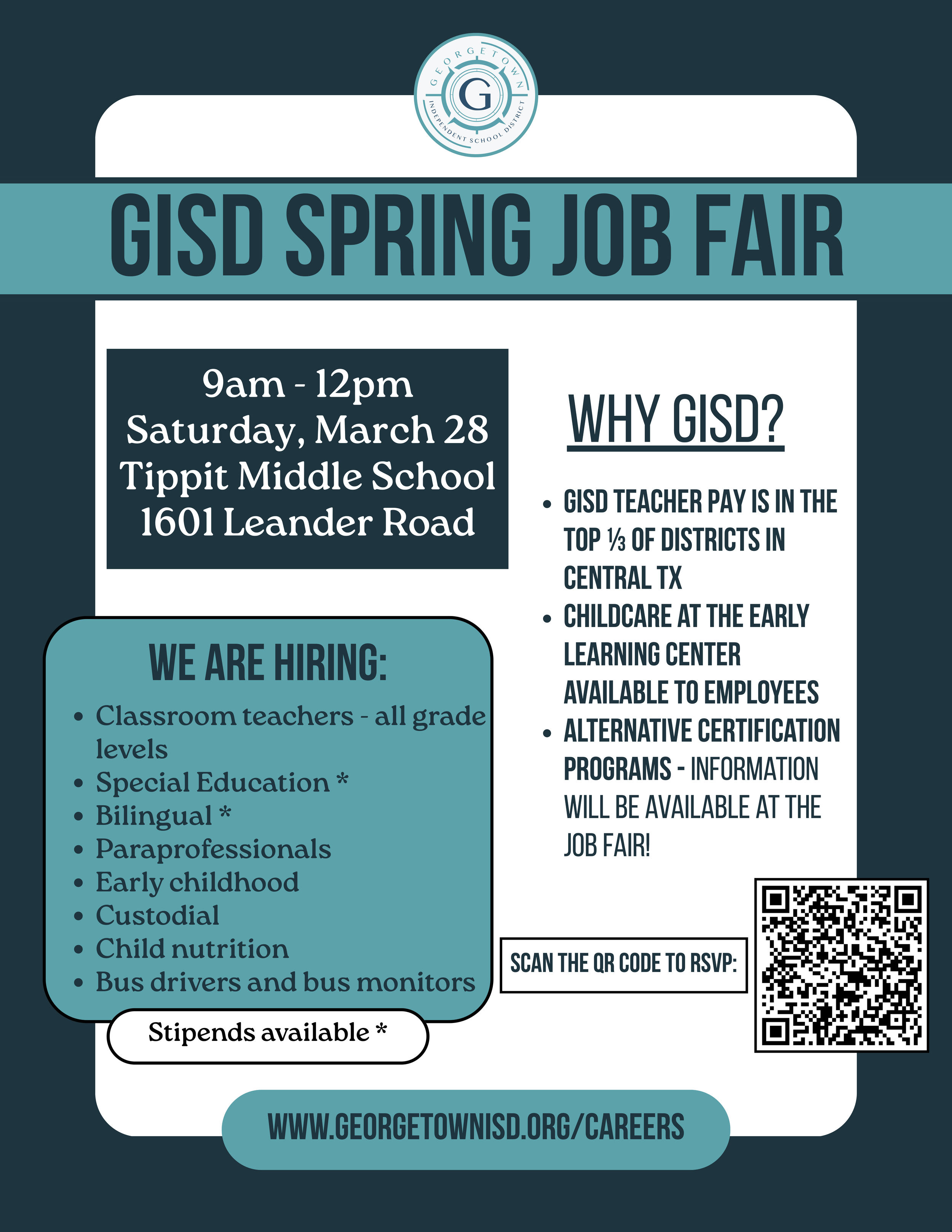 To view current open positions in Georgetown ISD, visit www.georgetownisd.org/careers.